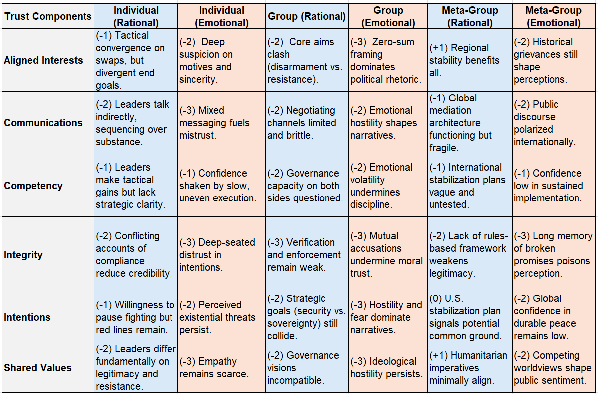 Lowest points: Integrity and Communications at all levels — signaling that credibility, verification, and message clarity are the greatest obstacles to any durable peace.